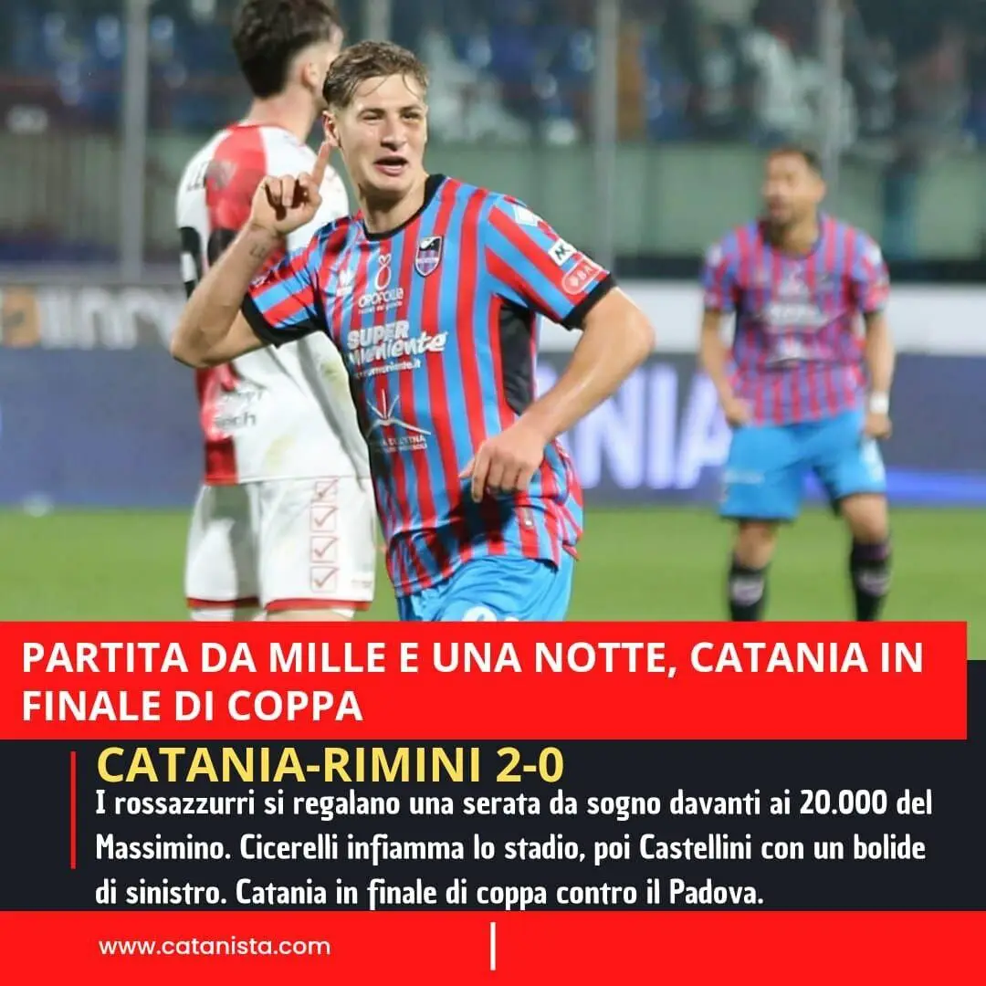 Una notte speciale per il Catania, che batte 2-0 il Rimini rimontando l'andata davanti ad un Massimino vestito per le grandissime occasioni. I rossazzurri nei primissimi minuti non aggrediscono più di tanto, ma osservano gli avversari nel loro atteggiamento, poi prendono sempre più campo cominciando a creare pericoli: fino al 18', quando un inserimento di Sturaro fa arrivare la palla a Cicerelli bravo a girare subito per il vantaggio. Poi il Catania cala leggermente nei ritmi, soprattutto nel secondo tempo quando Lamesta diventa sempre più pericoloso. Quando i supplementari sembrano inevitabili, un sinistro da lontano di Castellini illumina una nottata da sogno per tutti i presenti. In finale di Coppa ci vanno gli etnei, incontreranno il Padova, ma soprattutto avranno l'occasione di affrontare i play-off da testa di serie.