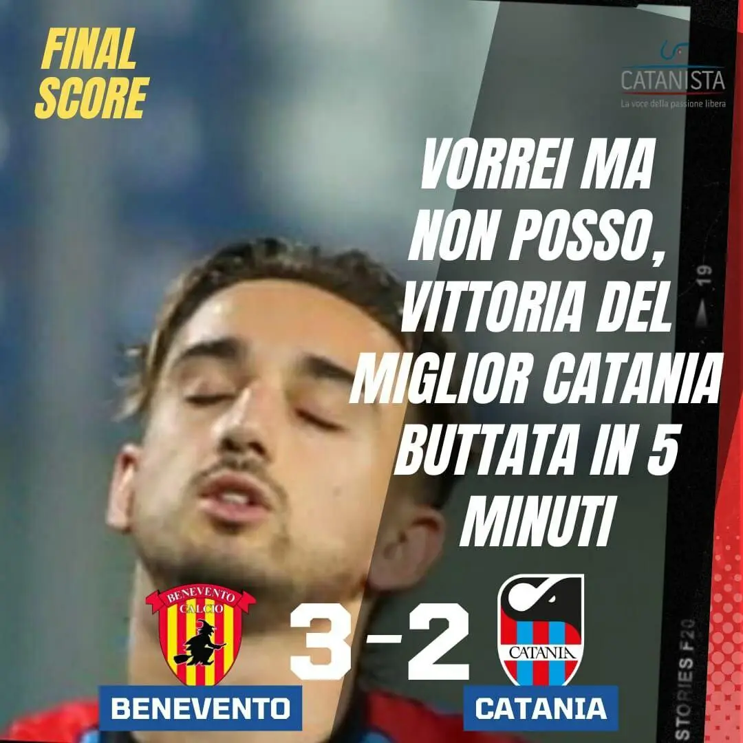 Benevento-Catania 3-2, cronaca e tabellino: vorrei ma non posso, vittoria buttata in 5 minuti