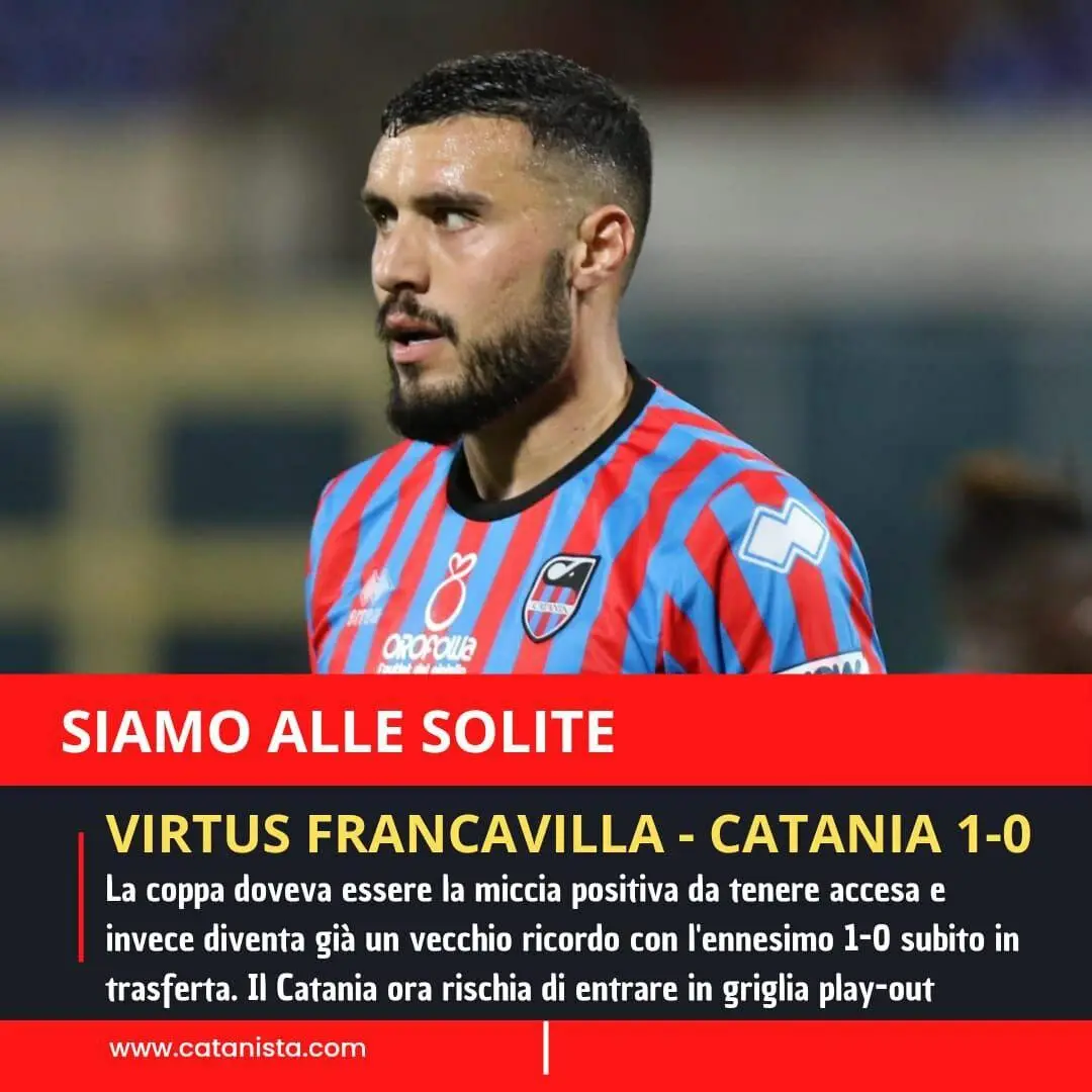 Via i festeggiamenti, via le belle sensazioni, via un Catania voglioso di vincere per far posto a quello visto praticamente in tutto il campionato: la Virtus Francavilla vince 1-0 facendo tutto sommato il minimo indispensabile per prendersi 3 punti fondamentali con il gol del solito Artistico nel secondo tempo. Per i rossazzurri due soli tiri in porta in 90'. La classifica diventa oltremodo pericolosa, si rischia di entrare in griglia play-out.