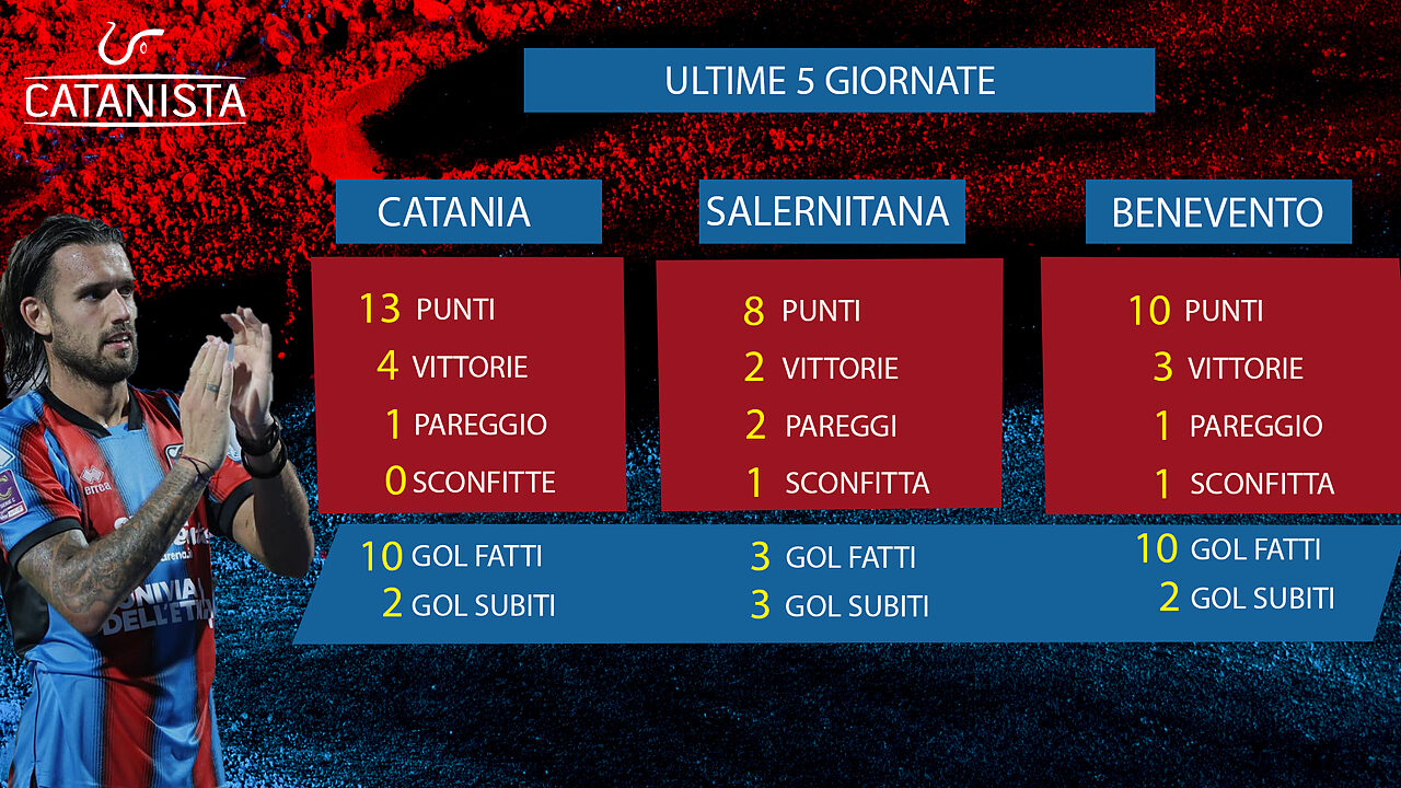 Nelle ultime cinque giornate, infatti, i rossazzurri guidano il terzetto con 13 punti conquistati e il meno 3 del Benevento è rappresentato proprio dalla sconfitta del Massimino, mentre è uguale il numero di pareggi (1). Ben diverso, invece, è stato il cammino della Salernitana. La formazione di Raffaele ha totalizzato appena 8 punti frutto di 2 vittorie, 2 pareggi ed 1 sconfitta. Il dato più emblematico però dell'ultimo mese riguarda i gol fatti e subiti. Mentre Catania e Benevento veleggiano con gli stessi numeri (10 gol siglati e 2 subiti), Inglese e compagni non hanno praticamente più visto la porta, timbrando il cartellino appena in 3 circostanze. Pochissimo per una squadra con un arsenale offensivo di primissimo livello che ha però messo a referto una media inferiore di un gol a partita.