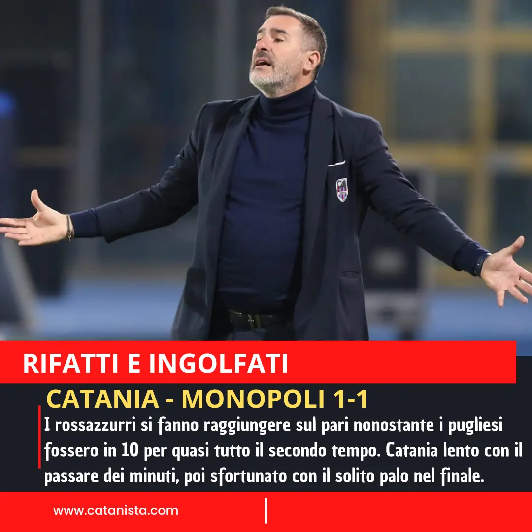 Non si va oltre il pari, nonostante la superiorità numerica durata quasi un tempo intero e la differenza, almeno sulla carta, che tecnicamente dovrebbe esserci tra Catania e Monopoli. Lucarelli butta nella mischia Chiricò, dandogli la possibilità di svariare al centro e sulla fascia, ma senza risultati e non trovando mai la soluzione ad un centrocampo in sofferenza anche dopo l'espulsione di Fazio. Eppure i rossazzurri in vantaggio ci erano passati, con la delizia di Cicerelli, ma anziché chiudere il match arretrano sempre più perdendo pericolosità, anche con i cambi in campo: Bizzotto la pareggia sugli sviluppi di una punizione e il Catania reagisce a singhiozzo, cogliendo il solito palo. Alla fine sono fischi, di un Massimino stanco della "costante" incostanza.